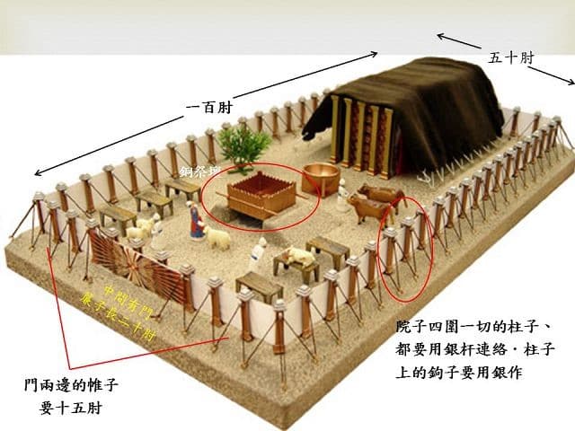 (2)v9~19會幕的院子。整座聖幕並不單指那帳幕,也包含帳幕外的院圍,以及院圍內的院子用作殺牲獻祭的地方。在這院子內,主要的擺設是洗濯盆和祭壇。院子結構的指示:院子面積有45公尺長乘22.5公尺 (150×75英尺), 空間相當寬敞。院子的周圍有2.5公尺高用麻紗造成帷帳掛在銅柱的銀勾上,並用繩和銅橛子使之穩固。院子的入口有9公尺闊,位於東面,掛上門簾,樣式和會幕的門簾一樣。──《串珠聖經註釋》