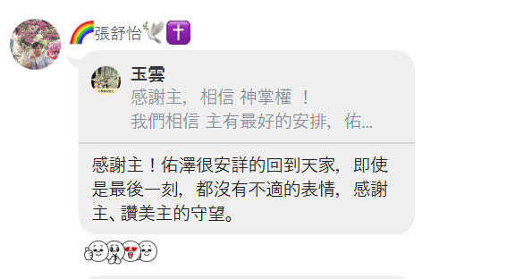 節錄昨天舒怡傳給我們的隻字片語:「…他(佑澤)現在面臨的狀況很複雜,但其實我們一直都沒有放棄禱告求神醫治,神也都有回應我們,讓佑澤面臨三次病危都能得以穩定出院,我們還是對神有信心,只是隨著病情的發展,給佑澤的禱告祝福方向變得不同。我相信神的大能不僅是醫治我們,更重要的是讓我們學會面臨死亡不會盲目恐懼,而是對天家的盼望,我有時間再細述,我先到醫院陪佑澤。再次謝謝大家對佑澤的關心和禱告!我們心中充滿感激和愛!感謝主差遣很多像天使一樣的弟兄姊妹陪伴我們身邊!」