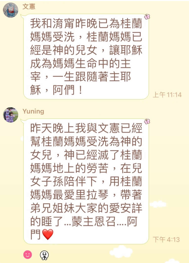 2024 – 05 – 29 文憲、淯寗為桂蘭媽媽受洗 文憲與淯寗是育賢家教會的一對夫妻,前二天淯寗母親因故急診不治。母親還沒信主,但是我請文憲夫妻在母親昏迷時(在加護病房)在耳邊傳福音並且憑信心施洗,將結果交給主,結果一天後離世,文憲夫妻有心裏準備但也因此得到安慰!求主祝福他們雙方的家族都能早日認識主,全家得救!