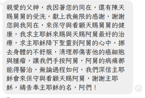 2024 – 09 – 23 文憲為舅舅施洗 感謝主,文憲弟兄前陣子上完了一對一門訓,開始傳福音給家人,先前為病危岳母桂蘭媽媽傳福音並且施洗。最近舅舅癌末探望,又鼓起勇氣傳福音,並且挑戰舅舅接受主受洗,結果舅舅與其家人竟都欣然願意接受,文憲便在病房為舅舅「陳天賜」弟兄施洗,歸主名下,感謝主的恩典,也求神繼續堅固這個家庭,得著屬天的平安與醫治!
