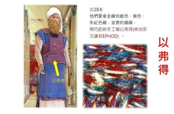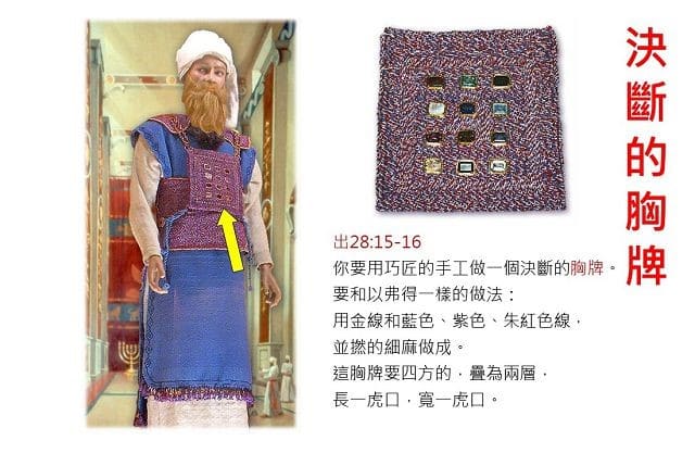28:15 「你要用巧匠的手工做一個決斷的胸牌。要和以弗得一樣的做法:用金線和藍色、紫色、朱紅色線,並撚的細麻做成。