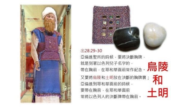 (2)v30「又要將烏陵和土明放在決斷的胸牌裡;亞倫進到耶和華面前的時候,要帶在胸前,在耶和華面前常將以色列人的決斷牌帶在胸前。」這個“烏陵”和“土明”究為何物,目前已不可考。有人認為是兩塊寶石、或籤、或骰子之類的東西。原文這兩字的意義是「光明」和「全備」,也有人認為“烏陵”的希伯來文意思似為“咒詛”,代表“否”;“土明”的意思為“完全”。代表“可”。當祭司面臨抉擇時,就可從胸牌的袋子中抽出神器,若抽出烏陵則表不同意,若抽出土明表示上帝同意,藉此來推斷上帝的旨意。因此,胸牌又稱為「決斷牌」,其實有點類似台灣今天常見的「擲茭」。