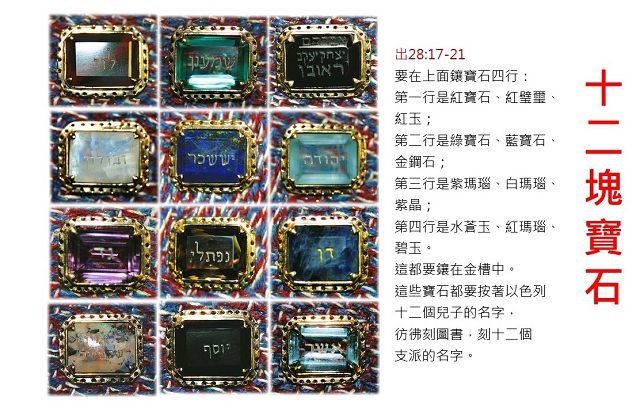 28:21 這些寶石都要按著以色列十二個兒子的名字,彷彿刻圖書,刻十二個支派的名字。