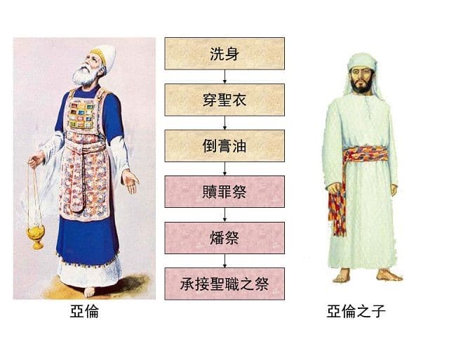 一、沐浴淨身;二、穿著聖袍;三、膏抹聖油;四、宰殺牛犢為潔淨祭;五、宰殺公綿羊為燔祭;六、宰殺公綿羊為承接聖職的舉祭和搖祭。