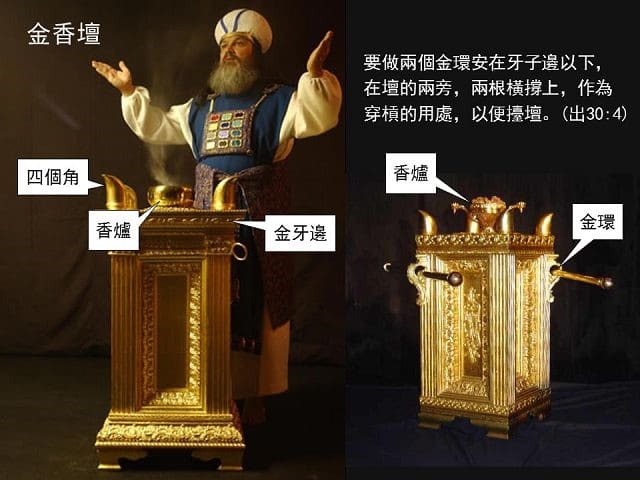一、規格:香壇是用純金包裹皂莢木製成,故又稱作金壇,以彰顯神的榮耀。長寬各約45公分,頂部呈四方形。而高度約90公分,與人的腰同高,方便祭司在壇上燒香。